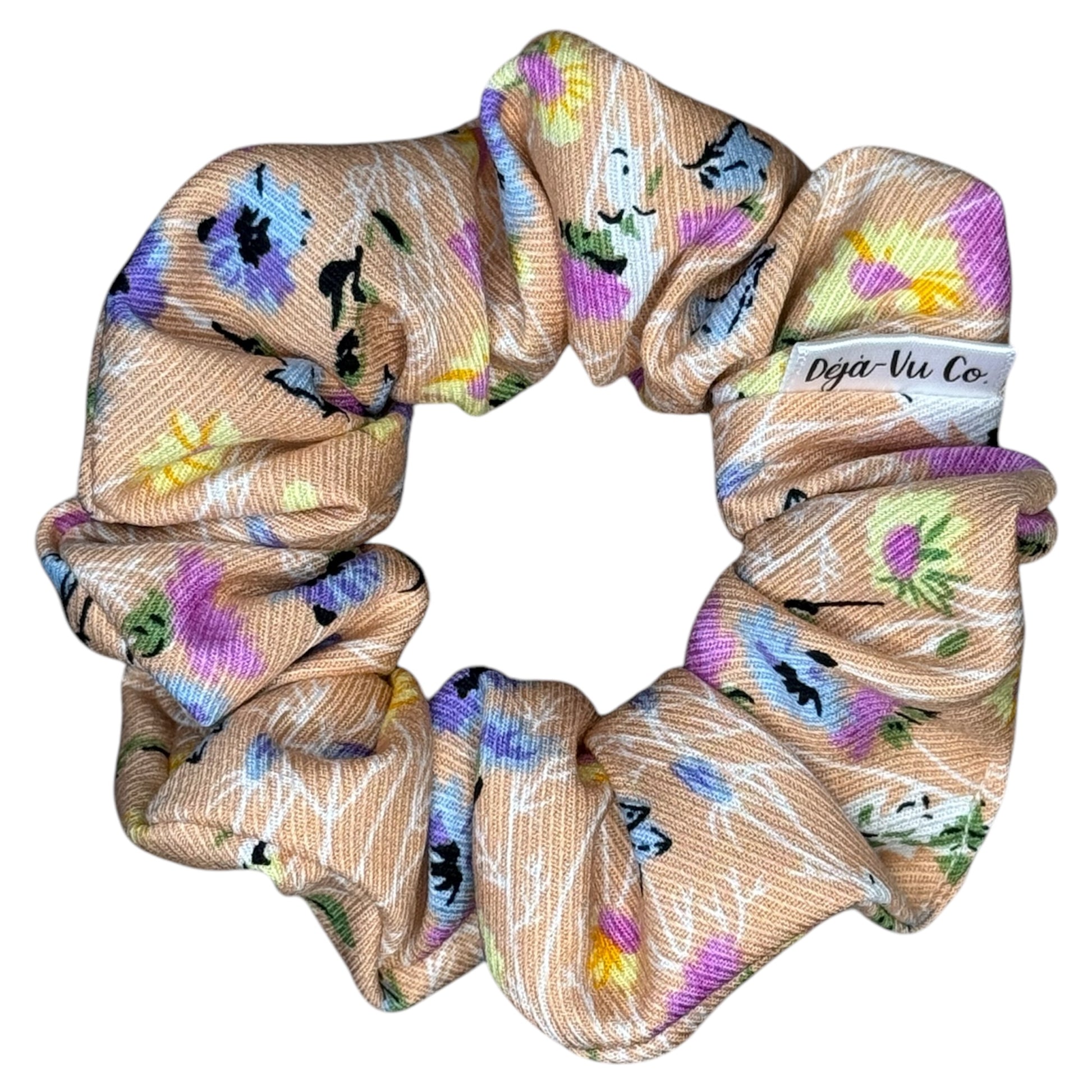 Introducing the Pastry scrunchie! Made with 100% viscose fabric, this stylish accessory features a beautiful floral print in blue, yellow, and pink tones on a pastel salmon background. Elevate any outfit with this trendy and versatile addition to your wardrobe.