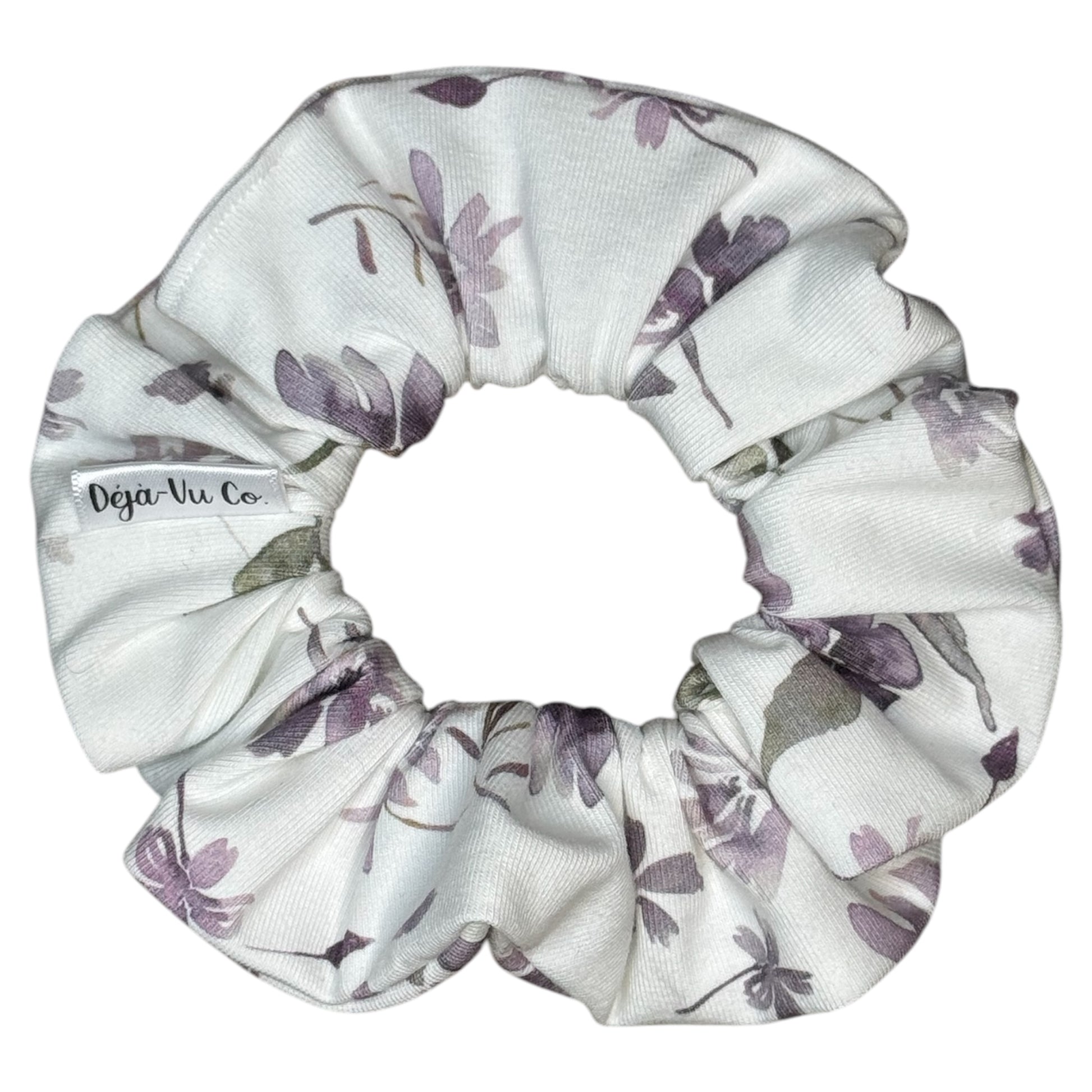 Add a touch of spring to your outfit with Violet. This scrunchie features delicate purple daisies and foliage on an off-white fabric. Perfect for any hair type and adds a pop of color to your look.